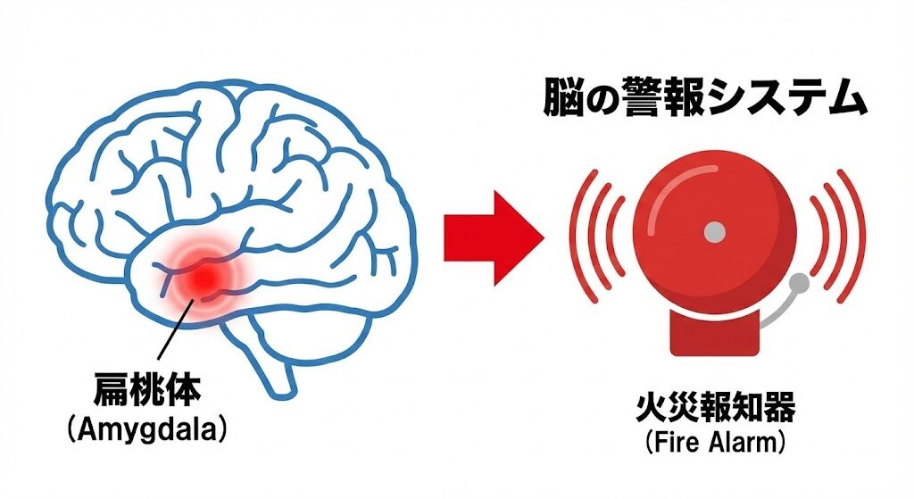 実際には火事(命の危険)でなくても、スピーチ前の緊張や上司の叱責などを「火事だ!」と勘違いして警報を鳴らしてしまう。これがパニックや過度な不安の正体です。