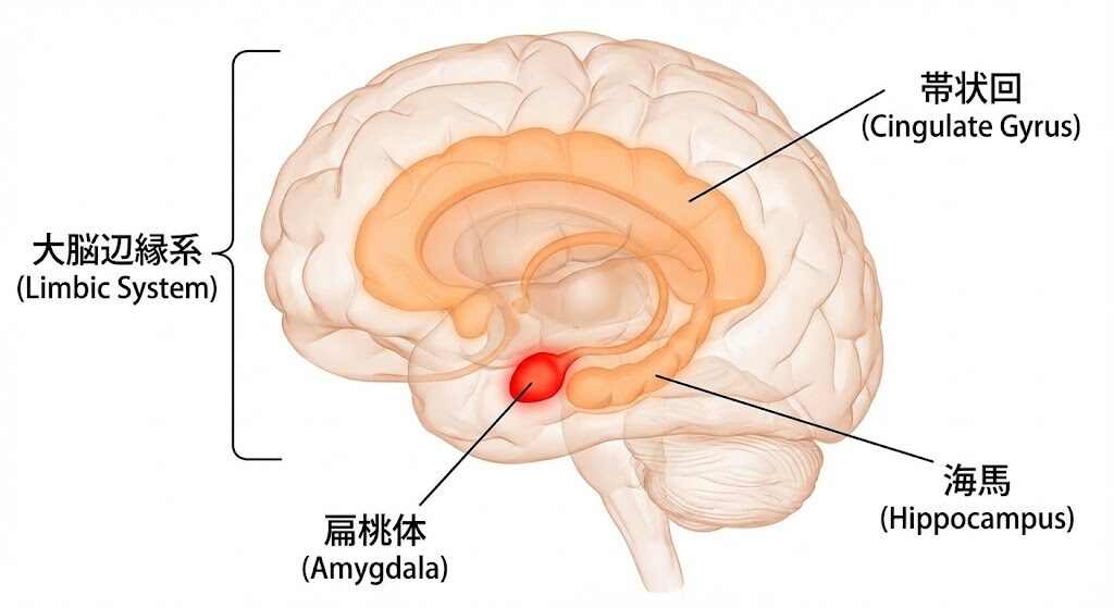 記憶の中枢である「海馬」と隣接していることは、感情を伴う記憶(トラウマなど)が強く残りやすい理由と深く関係しています。