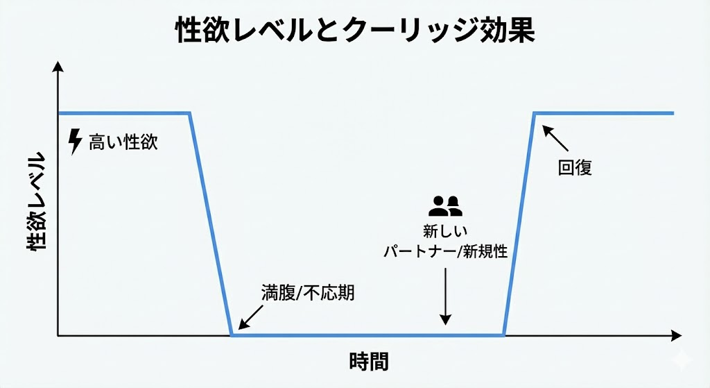 オスは射精後、プロラクチンなどのホルモンが分泌され、「賢者タイム」と呼ばれる不応期(Refractory Period)に入ります。 これはエネルギーを温存するための生理的なブレーキです。