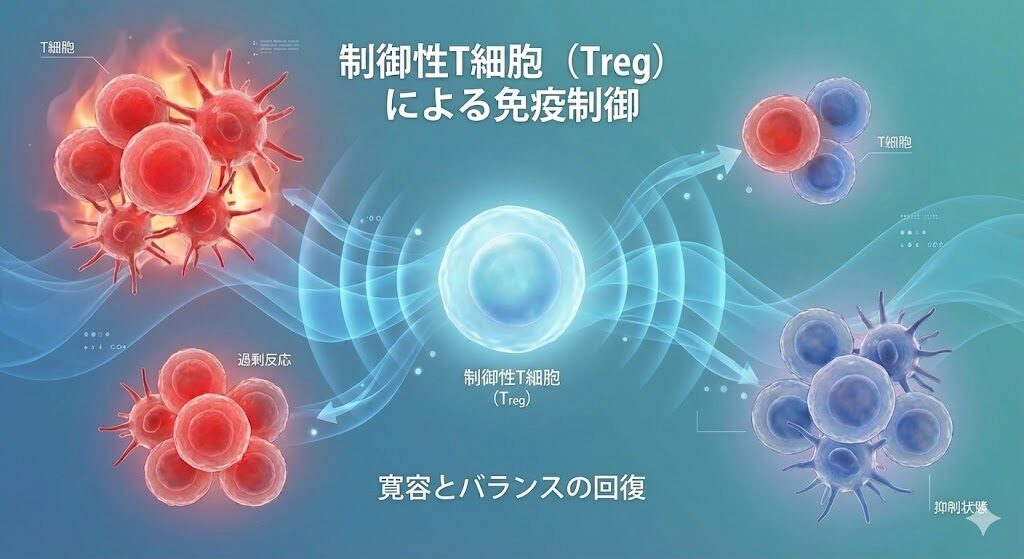 Tregは、過剰な免疫反応を抑制し、自己や無害な抗原(花粉や食物)への攻撃を停止させる「免疫寛容(Immune Tolerance)」を誘導する役割を持ちます。