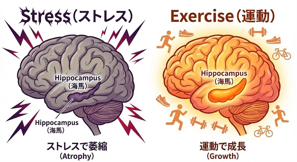 海馬の最大の特徴は、環境や状況によって物理的に変化する「可塑性(Plasticity)」の高さにあります。これには負の側面と正の側面があります。