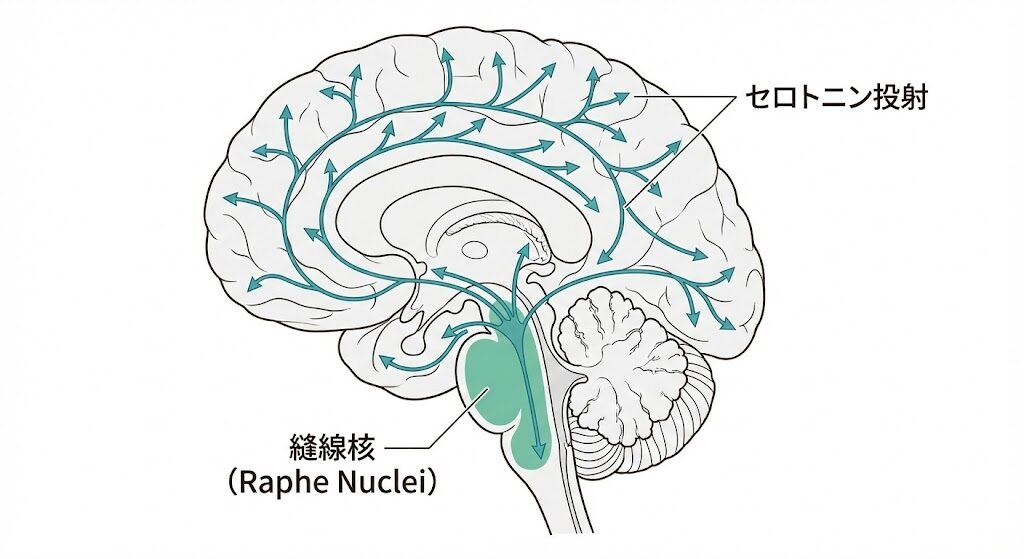 脳幹の正中線に位置する「縫線核(ほうせんかく|Raphe Nuclei)」にセロトニン作動性ニューロンの細胞体が存在します。 ここから大脳皮質、大脳辺縁系、視床下部、脊髄など脳全体に向けて軸索を伸ばし、シャワーのように広範囲へセロトニンを放出(広範投射)しています。