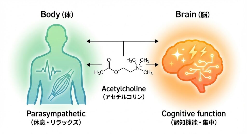 アセチルコリンは、私たちの体をメンテナンス(休息)し、同時に脳をクリエイティブなモード(覚醒)へ導く、生命維持と知的活動の両輪を支える物質です。